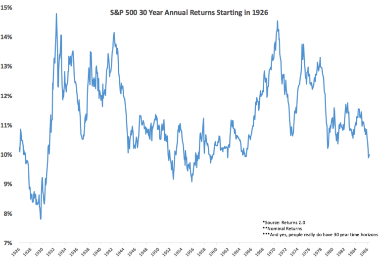 The worst 30 year return — using rolling monthly performance — occurred at the height of the market just before the Great Depression and stocks still returned almost 8% per year over the ensuing three decades.